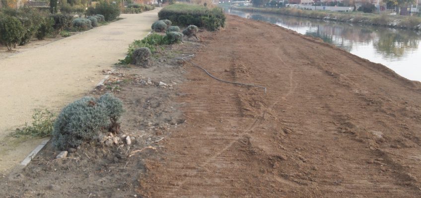 La phase suivante, terminée tout début décembre, a vu l’amenée de terre. Celle-ci a été étalée par la pelleteuse, créant ainsi un rapprochement (équilibre) de niveau avec le reste de la berge où se trouve le chemin piéton.
